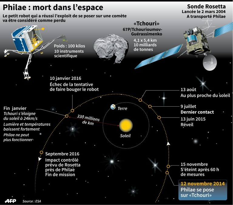 L'espoir de renouer le contact avec le petit robot, muet depuis plus de six mois, est devenu extrêmement faible mais l'Europe peine à lui dire adieu.Après dix ans de voyage comme passager de la sonde Rosetta, Philae a réalisé le 12 novembre 2014 une première historique en atterrissant sur la comète "Tchouri". Au bout de quelques rebonds, il s'est stabilisé à l'ombre, en position couchée.