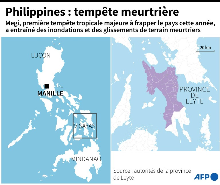 Les secouristes de la municipalité d'Abuyog ont récupéré des douzaines de corps dans un village cÎtier détruit par un glissement de terrain mardi. Au moins 42 personnes ont été tuées dans des glissements de terrain dans trois villages de la municipalité, selon la police. Une autre personne s'est noyée.