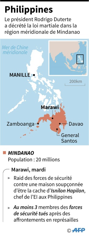 M. Duterte a imposé la loi martiale mardi soir dans la région de Mindanao, lorsque des combattants ayant prêté serment à l'organisation jihadiste Etat islamique (EI) se sont affrontés aux forces de sécurité et ont incendié des bâtiments dans la localité de Marawi.