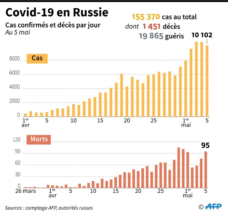 Selon les statistiques officielles divulguées mardi, 10.102 nouveaux cas ont été enregistrés lors des 24 dernières heures, à peine moins que les deux jours précédents. La Russie compte désormais 155.370 cas. Mais le bilan officiel des décès attribués au Covid-19 est de 1.451 morts, soit un taux de mortalité très faible par rapport à ce qui a été enregistré en Italie, en Espagne ou aux Etats-Unis.