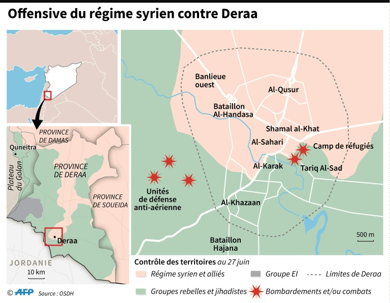 Les forces du régime ont lancé le 19 juin une offensive pour reprendre les secteurs rebelles du sud syrien, région sensible bordant la frontière avec la Jordanie et le plateau du Golan en partie occupé par Israël.