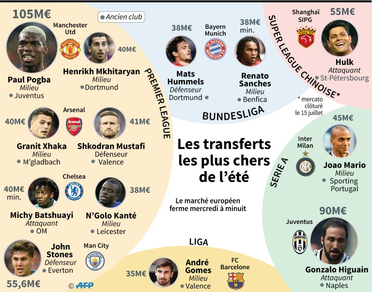 . Paul Pogba (Manchester United): la crête la plus célèbre du football mondial coiffe désormais le joueur le plus cher de l'histoire. 105 millions d'euros, plus 5 de bonus, c'est la fortune déboursée par Manchester United pour s'offrir le Français, finaliste du dernier Euro-2016. Une somme d'autant plus folle que Pogba avait quitté United en catimini, il y a quatre ans, pour zéro euro... Le joueur, qui clame son désir d'être un jour Ballon d'Or, est attendu au tournant.