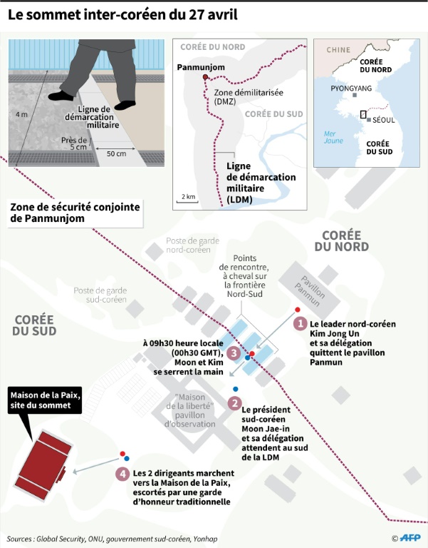 Le dirigeant nord-coréen Kim Jong Un et le président sud-coréen Moon Jae-in étaient réunis vendredi pour un sommet historique après une poignée de main hautement symbolique sur la Ligne de démarcation militaire qui divise la péninsule.