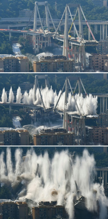 La détonation a été déclenchée à 09H37 (07H37 GMT) et les quelque 4.500 tonnes de béton et d'acier des deux immenses piles à haubans n°10 et 11 se sont effondrées en sept secondes dans un nuage de poussière, sous les yeux et quelques applaudissements de nombreux Gênois venus assister à distance à la démolition.