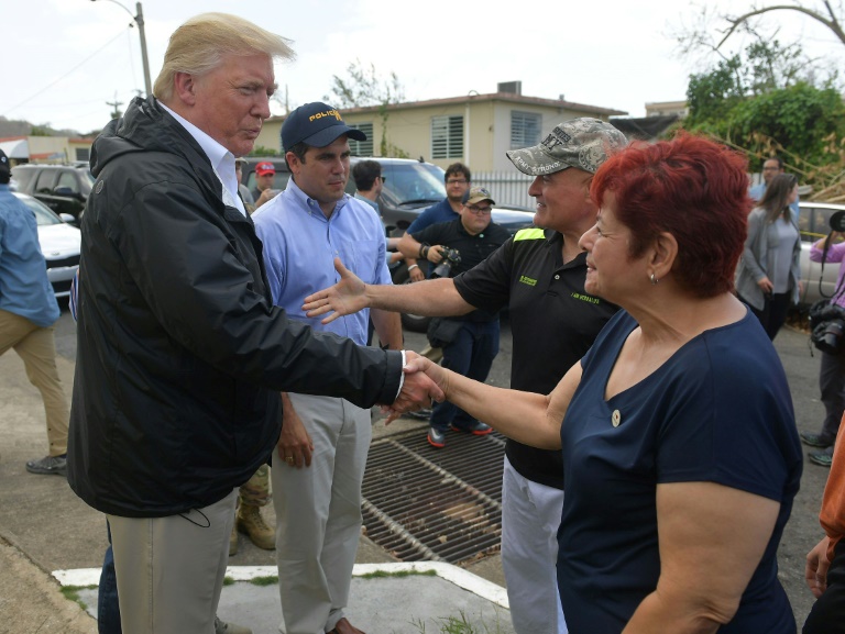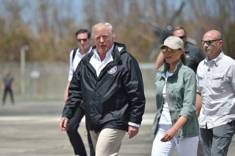 Portant une parka sombre sur une chemise blanche, le président américain et la Première dame Melania Trump, casquette sur la tête et toute vêtue de blanc et gris, ont parcouru les rues de la petite ville de Guaynabo où nombre d'arbres sont toujours au sol deux semaines après le passage de l'ouragan.