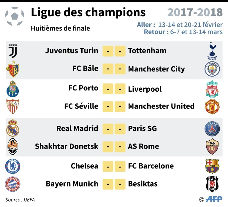 Et, comme le Real est tombé sur le PSG, la plupart des prétendants au titre affrontent des équipes au pedigree plus modeste: le Bayern Munich, qui avait terminé 2e derrière Paris, ira chez les Turcs de Besiktas au retour, Manchester United affrontera le Séville FC, Manchester City les Suisses de Bâle, la Juventus Turin, finaliste la saison dernière, défiera Tottenham. Seul, le FC Barcelone n'a pas été gâté avec le tenant du titre de Premier League anglaise, Chelsea.