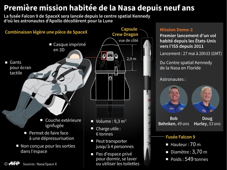 Il a beaucoup plu ces derniers jours en Floride, et les prévisionnistes de Cap Canaveral estimaient mardi à 40% le risque de temps défavorable mercredi. Au besoin, le vol sera reporté à samedi. Crew Dragon est une capsule comme Apollo, mais version XXIe siècle. Des écrans tactiles ont remplacé boutons et manettes. L'intérieur est dominé par le blanc, l'éclairage plus subtil.