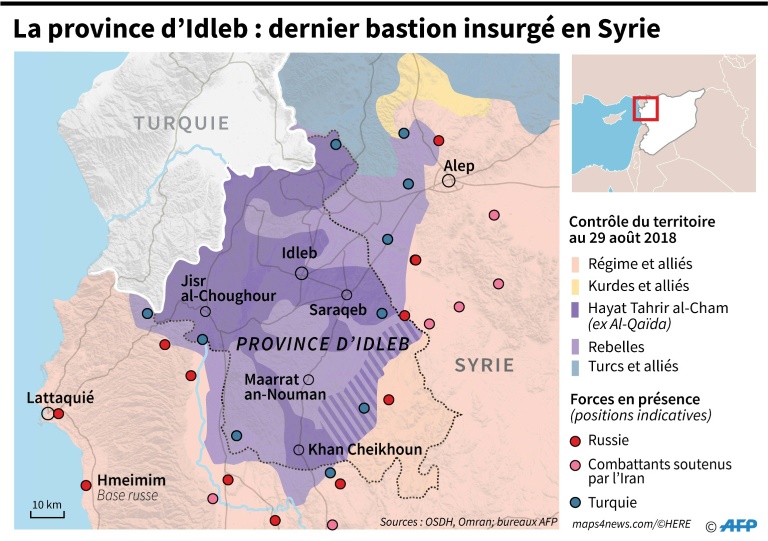 Car Idleb est le dernier grand fief insurgé où ont été envoyés des milliers de rebelles et de jihadistes, à mesure que le régime de Bachar al-Assad, aidé par la Russie, l'Iran et le Hezbollah libanais, a réussi à reprendre près des deux-tiers du territoire. La province est contrôlée à 60% par les jihadistes de Hayat Tahrir al-Cham, groupe dominé par l'ex-branche syrienne d'Al-Qaïda, ainsi que par des factions rebelles. Celles-ci et le groupe HTS se mènent une guerre interne avec assassinats et rapts.