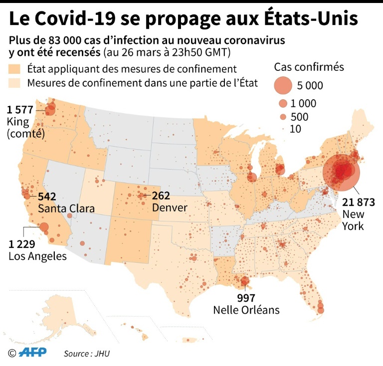 L'Etat de New York a émergé comme l'épicentre de l'épidémie aux Etats-Unis, avec près de 45.000 cas et plus de 500 morts vendredi, des nombres qui évoluent rapidement. Suivent l'Etat voisin du New Jersey, la Californie, l'Etat de Washington, le Michigan et l'Illinois, avec des concentrations dans les grandes villes, comme à New York.