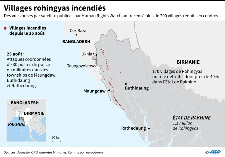 "C'est une action du groupe terroriste ARSA", a-t-il ajouté, utilisant l'acronyme du groupe Armée du Salut des Rohingyas de l'Arakan, rébellion organisée qui a émergé en octobre 2016 et dont les attaques en août ont déclenché la répression de l'armée.