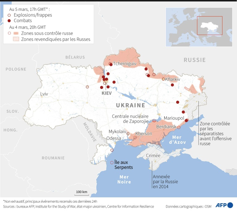 L'armée russe maintenait dimanche la pression sur le sud de l'Ukraine et sur Kiev au onzième jour de l'invasion, le président Vladimir Poutine menaçant de priver le pays de son "statut d'Etat" et comparant les sanctions internationales qui frappent la Russie à une "déclaration de guerre".