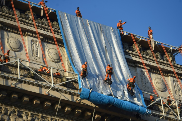 Plusieurs centaines de mètres carrés de tissu recyclable en polypropylène argent bleuté, prévu pour ondoyer au gré des éléments, ont été déroulés dimanche sur l'un des côtés de l'Arc de Triomphe, opération lançant la dernière ligne droite de l'empaquetage du monument parisien.