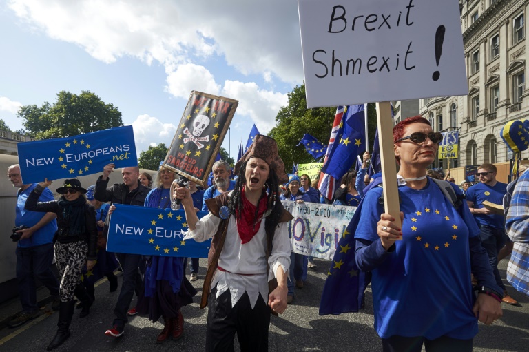 Signe d'un pays toujours divisé sur la question, plusieurs milliers de personnes ont manifesté samedi dans le centre de Londres pour demander au gouvernement de "renoncer au Brexit". "A l'aide! Nous sommes pris au piège sur une petite île contrôlée par des cinglés!", clamait un message écrit sur une pancarte au milieu d'un océan de drapeaux européens.