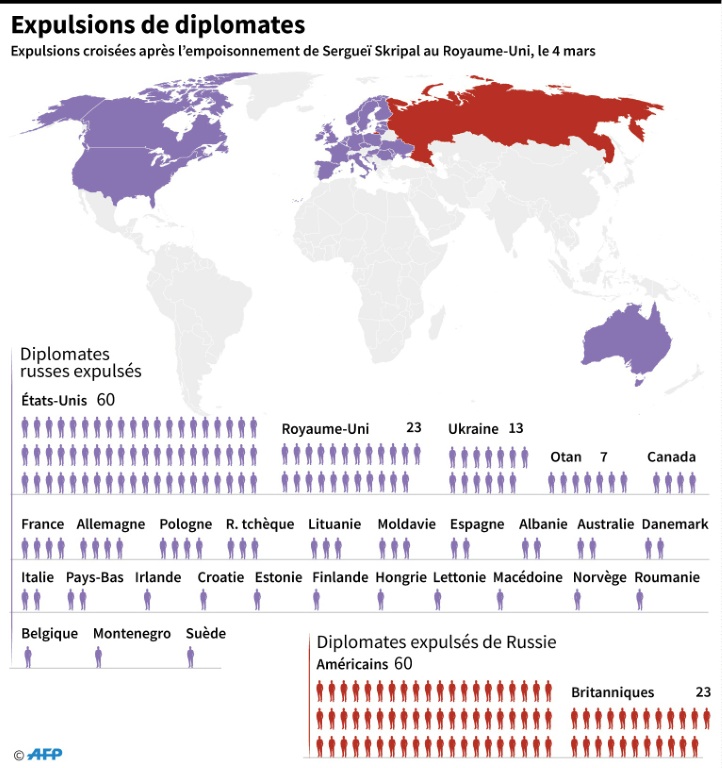 La Russie a en outre annoncé jeudi qu'elle allait expulser 60 diplomates américains et fermer le consulat des Etats-Unis à Saint-Pétersbourg. Un nombre presque identique, au total, d'Européens, de Canadiens et d'Australiens vont connaître le même sort, a fait savoir vendredi Moscou.