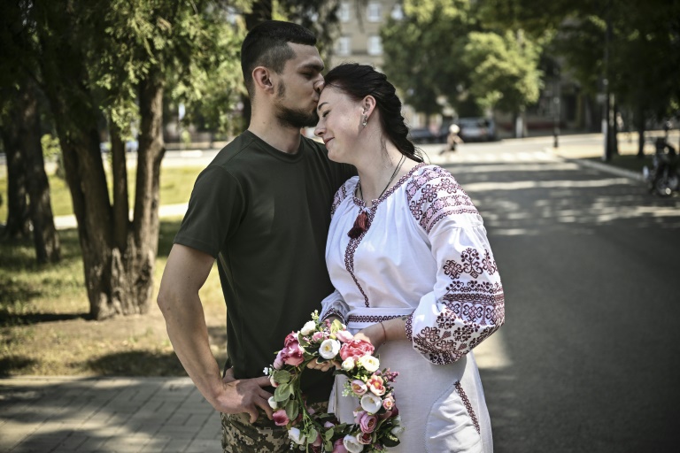Les sirènes anti-bombardement se font entendre et la mariée est en tenue de camouflage: dans le petit village de Droujkivka dimanche, à une quarantaine de kilomètres du front dans l'est de l'Ukraine, deux jeunes couples de soldats ukrainiens se sont dit "oui".
