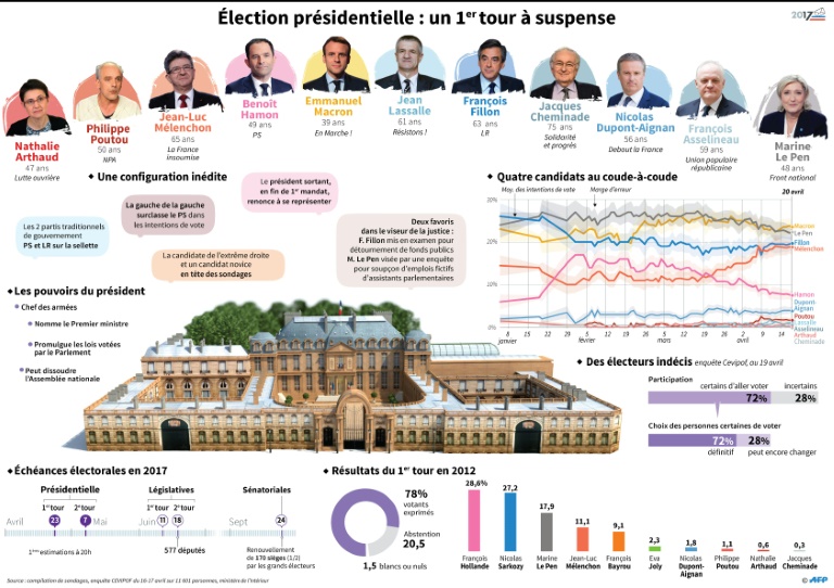 Pour donner un dernier élan à une campagne riche en surprises et en rebondissements, dominée ces derniers jours par un match à quatre (Macron-Le Pen-Fillon-Mélenchon) à fort suspense, les onze candidats avaient tous prévu meeting, déplacement ou discours.