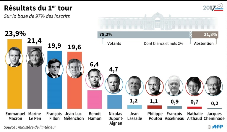 Emmanuel Macron et Marine Le Pen se sont qualifiés dimanche pour le second tour de l'élection présidentielle, avec respectivement 23,75% et 21,53% des 35.503.471 suffrages exprimés, selon les résultats globaux hors Français de l'étranger donnés par le ministère de l'Intérieur lundi.