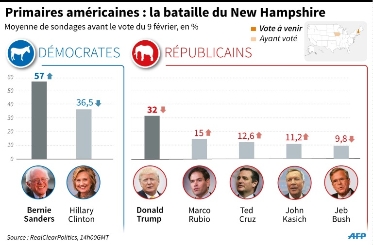 Après une longue campagne semée d'insultes, le petit Etat américain du New Hampshire a commencé à voter mardi pour ses primaires présidentielles, avec en tête des sondages deux outsiders, le républicain Donald Trump et le démocrate Bernie Sanders face à Hillary Clinton.