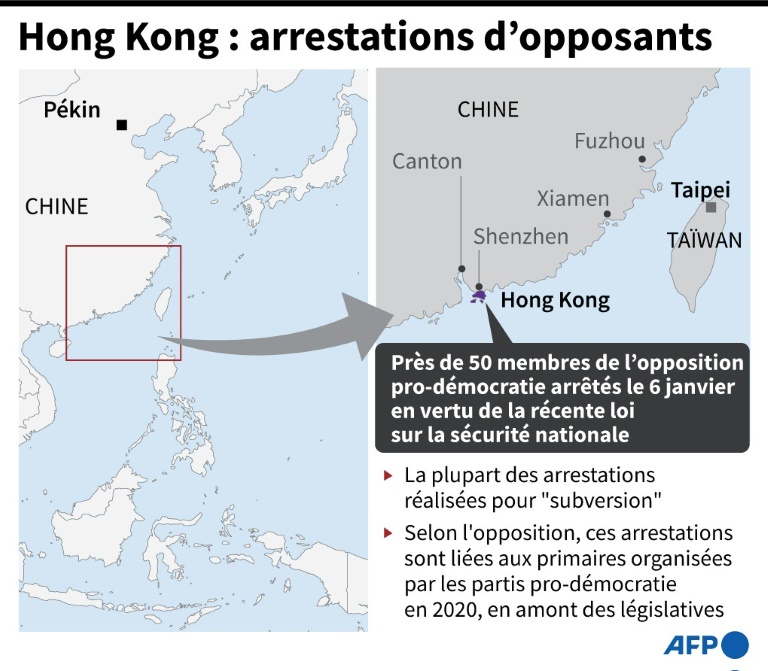 La police a annoncé que 47 étaient poursuivies pour "complot en vue de commettre un acte de subversion", l'une des qualifications visées par la loi sur la sécurité nationale que Pékin a imposée à Hong Kong en réponse aux mois de manifestations qui avaient ébranlé la ville en 2019.
