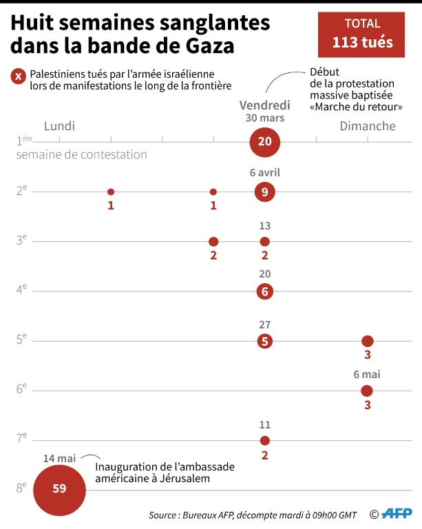La bande de Gaza est le théâtre depuis le 30 mars d'un mouvement, la "marche du retour", qui a culminé lundi avec des affrontements dans lesquels près de 60 Palestiniens ont été tués par des tirs israéliens.