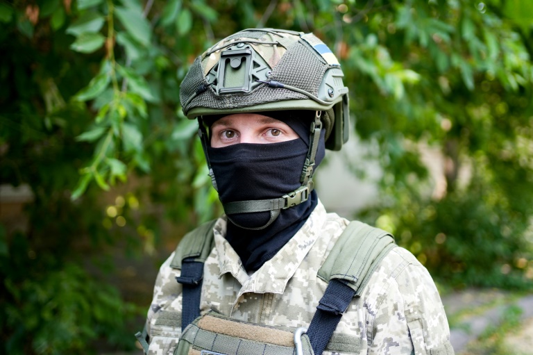"En temps de guerre, nous avons appris à l'utiliser un peu différemment. Remplacer une grenade par une bouteille d'eau, ce n'est pas un problème, elles ont le même poids", dit-il, le visage recouvert d'un masque.
