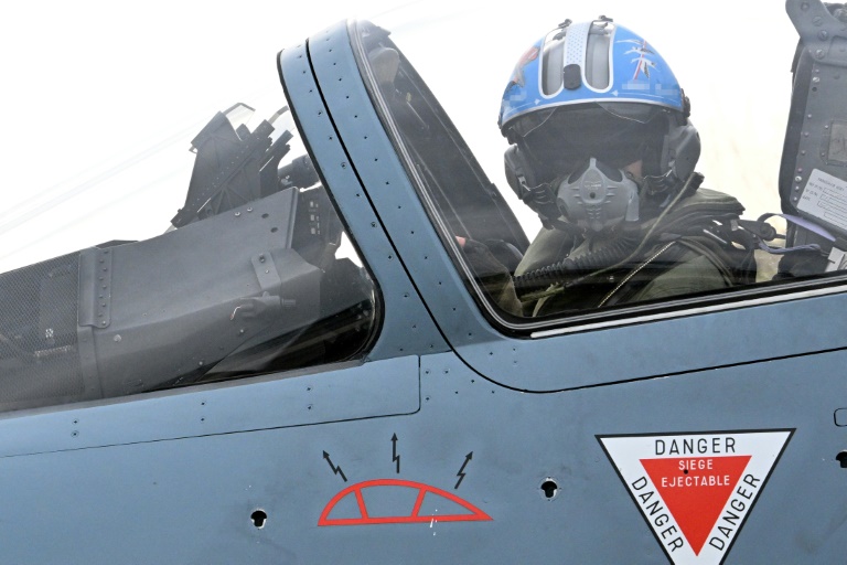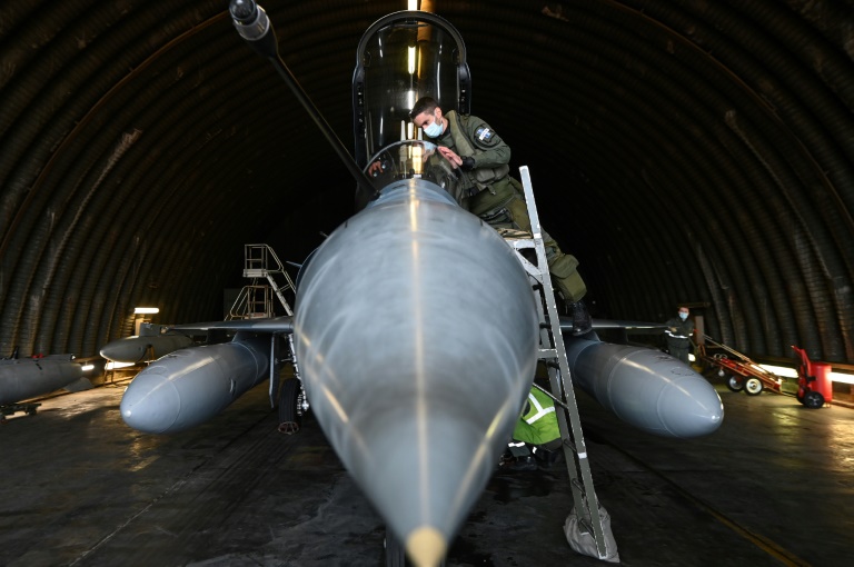 Dernier contrôle sur les trois réservoirs de kérosène d'appoint pour vérifier qu'ils sont bien accrochés et dernières vérifications dans le cockpit: le commandant français Mickaël effectue un ultime tour de son Mirage 2000-5F avant de décoller pour une mission de "police du ciel" au-dessus de l'Estonie, pays frontalier de la Russie.