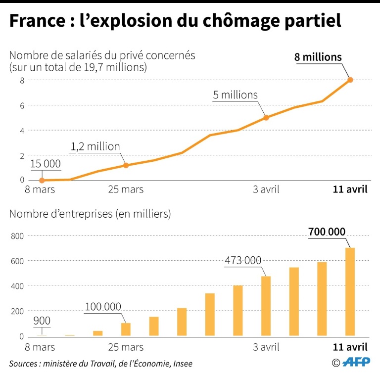 Le chômage partiel, qui concerne actuellement 8 millions de salariés, coûtera 24 milliards d'euros, a indiqué le ministre de l'Economie Bruno Le Maire sur BFMTV/RMC, ajoutant que l'effort public d'aide à l'économie atteindrait "plus de 100 milliards d'euros. La partie du fonds de solidarité réservée aux entreprises menacées de faillite va être renforcée et le montant de ce fonds porté au total à 7 milliards d'euros, a aussi avancé M. Le Maire.