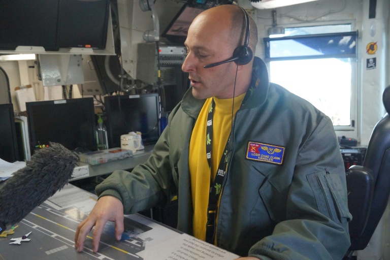 Une fois que ce pilote est aux commandes de son F18, il est entre les mains du contrôleur du pont d'envol, Chad Clark, chargé de mettre en position son appareil sur la catapulte.