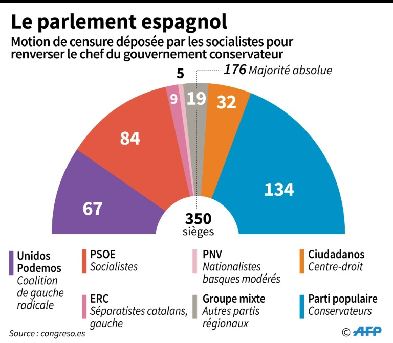 La condamnation du PP dans le procès Gürtel pour avoir bénéficié de fonds obtenus illégalement aura donc été l'affaire de trop pour M. Rajoy, dont le PP est empêtré dans plusieurs scandales, et qui devrait devenir vendredi le premier chef de gouvernement renversé par une motion de censure en Espagne depuis le retour à la démocratie. Les trois précédentes (1980, 1987, et 2017 déjà contre lui) ont échoué.