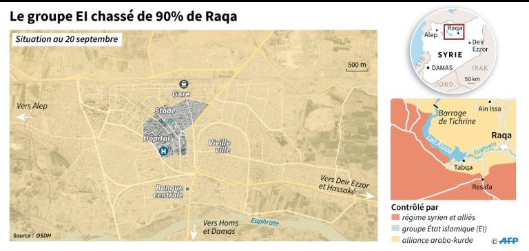 Outre leurs adversaires irakiens et syriens, l'EI est confronté aux puissantes aviations de la Russie, alliée de Bachar al-Assad, et de la coalition internationale antijihadistes conduite par Washington. Les forces démocratiques syriennes (FDS), alliance de combattants arabes et kurdes, et des forces spéciales américaines nettoient les dernières poches de l'EI à Raqa, a rapporté jeudi soir l'Observatoire syrien des droits de l'Homme (OSDH).
