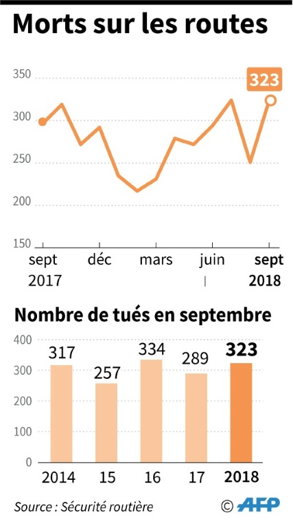 Un total de 323 personnes ont été tuées en septembre, soit 26 de plus (+8,8%) que l'an dernier à la même période. Le nombre d'accidents est également en hausse (5.373, 285 de plus, +5,6%), tout comme le nombre de blessés (+6.568, 273 de plus, +4,3%). La tendance générale reste toutefois à la baisse: entre octobre 2017 et septembre 2018, le nombre de tués sur les routes est en recul de 4,8% (3.309 morts). Sur les neuf premiers mois de l'année, la Sécurité routière a recensé 137 morts de moins que pendant la même période en 2017 (2.426 contre 2.563).
