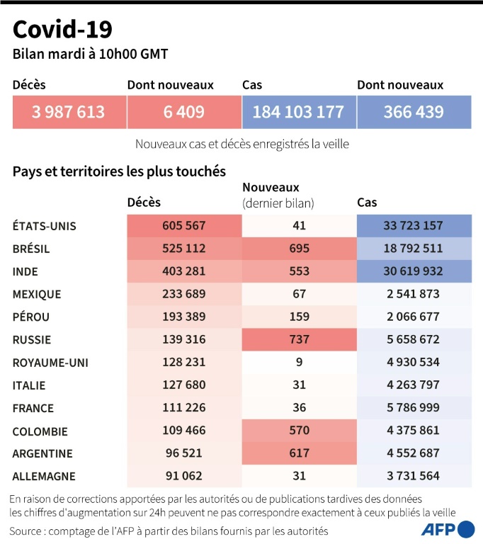 La pandémie, qui a fait près de quatre millions de morts, frappe aussi de plein fouet la Russie, qui a recensé mardi 737 morts du Covid en 24 heures, un record depuis le début de la pandémie pour le pays.