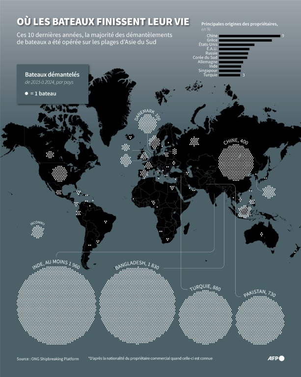 Près d'un tiers des 409 démantelés dans le monde en 2024 ont fini à Chittagong, d'après la coalition d'ONG Shipbreaking Platform. Les autres ont en majorité terminé en Inde, au Pakistan, en Turquie.