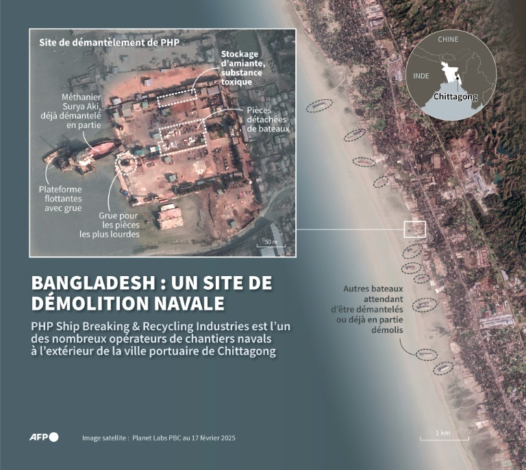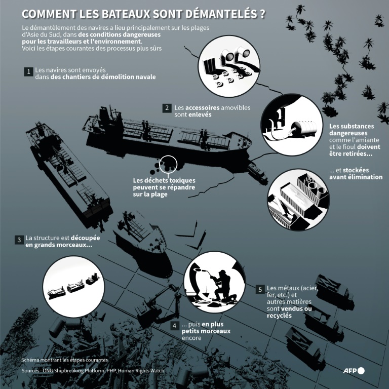 Au Bangladesh, "des matières toxiques provenant des navires, dont de l'amiante, sont (...) dans certains cas revendues sur le marché de l'occasion", relevaient dans un rapport de 2023 Shipbreaking Platform et Human Rights Watch.