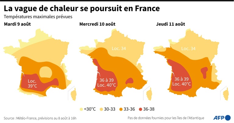 La canicule regagne du terrain mercredi dans le sud-ouest avec des températures maximales prévues jusqu'à 40 degrés localement, mais devrait prendre fin dimanche avec des orages attendus dans toute la France.