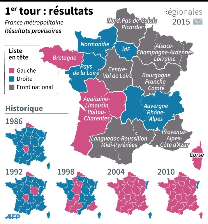 La France se réveille lundi sous "le choc" de la percée historique du Front national au premier tour des élections régionales, le FN arrivant en tête dans six régions et le PS se retirant dans les deux les plus sensibles, Nord-Pas-de-Calais-Picardie et PACA.