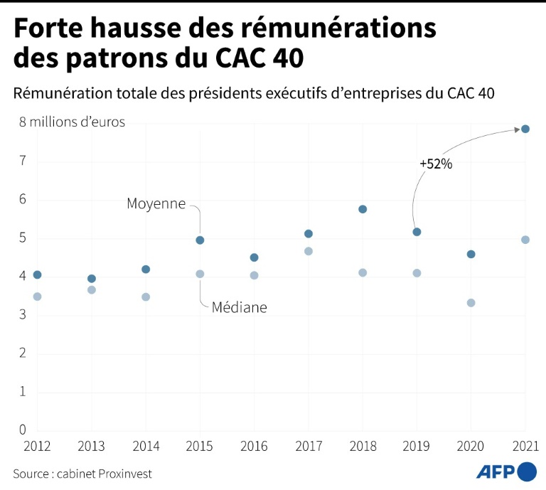 En tout, 29 dirigeants dépassent ce plafond, contre 14 en 2020 et 24 en 2019, ce qui devrait relancer le débat sur le pouvoir d'achat des plus modestes, amputés en outre par l'inflation.
