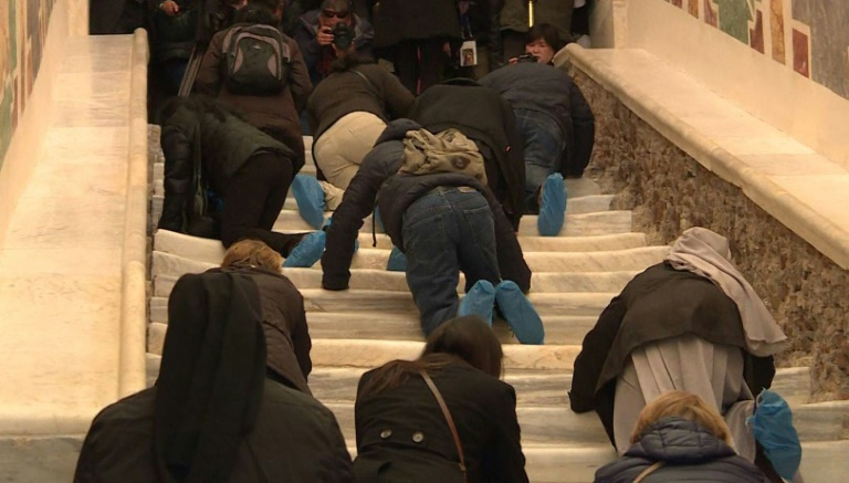 Nina, une Ukrainienne vivant à Rome, était parmi l'une des premières à monter à genoux ces marches, usées parfois jusqu'à 15 cm de profondeur par des siècles de ferveur chrétienne. "Je suis venue pour prier pour mon pays en guerre", a-t-elle déclaré à l'AFP.