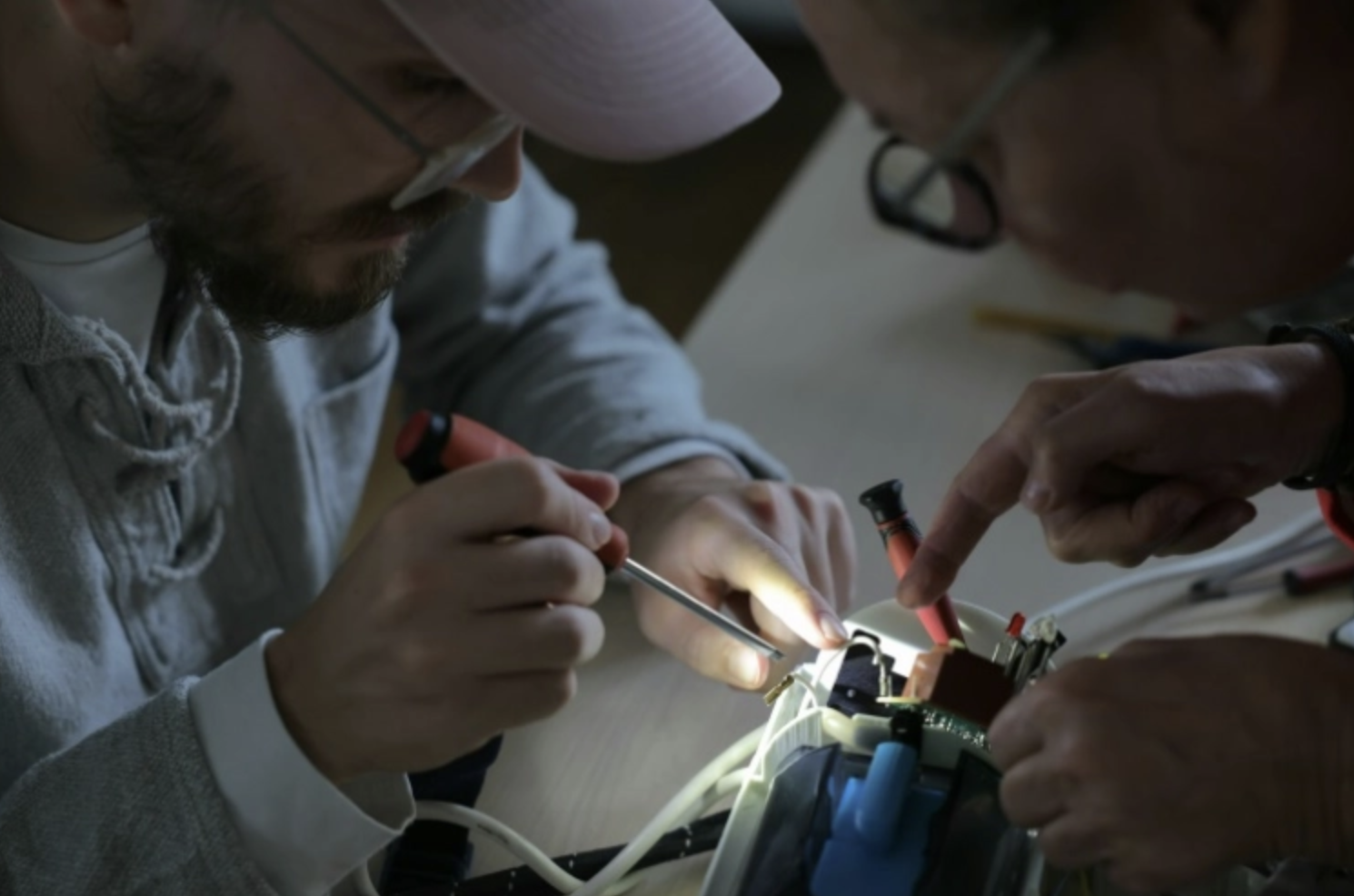 Pince ou tournevis en main, les débutants se font aider par les plus expérimentés, n'hésitant pas à leur poser des questions pour comprendre le fonctionnement d'une électrovanne, ou la différence entre un watt et un volt.