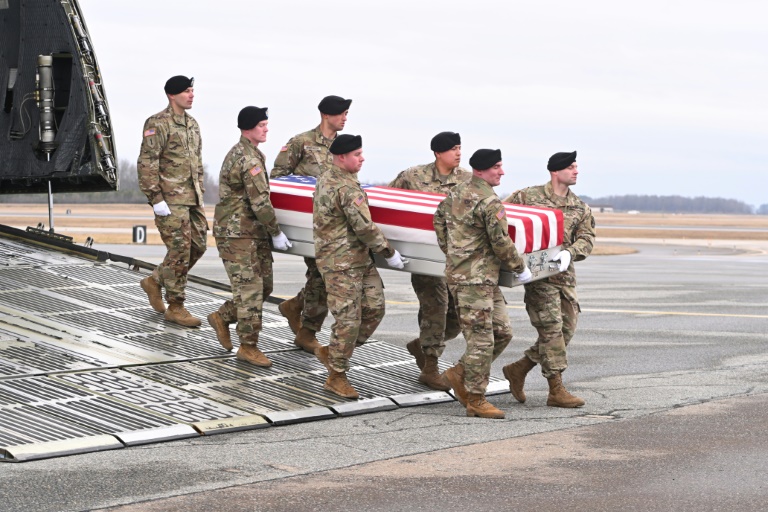 Les corps de William Jerome Rivers, Kennedy Ladon Sanders et Breonna Alexsondria Moffett, militaires de l'Etat américain de Géorgie (sud) et tués par une attaque de drone près de la frontière syrienne, sont reçus avec les honneurs sur cette base de Dover (Delaware, nord-est).