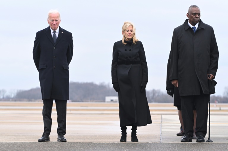 Ce rituel militaire, lors duquel les dépouilles sont débarquées une à une d'un avion de transport militaire et chargées dans un véhicule, est réglé au millimètre, en présence également de l'épouse du président, Jill Biden, et d'officiels dont le chef du Pentagone Lloyd Austin.