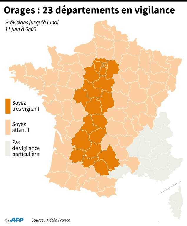 Météo-France a placé 23 départements sous vigilance orange en raison d'une "situation fortement orageuse d'été" avec "un risque fort de phénomène violent".