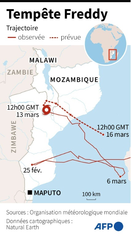 Le cyclone Freddy, "hors norme" car il a fait une boucle rarement observée par les météorologues, a fait plus de 100 morts au Malawi et au Mozambique en revenant frapper l'Afrique australe, selon de nouveaux bilans des autorités et ONG lundi.