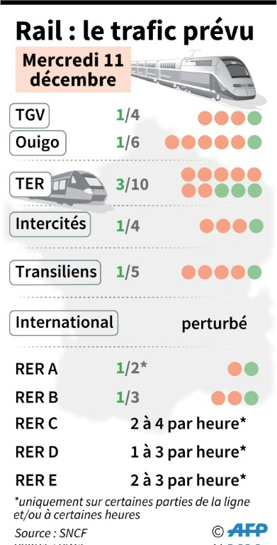 Mercredi ne fait pas exception: les conditions de déplacements restent très difficiles. La SNCF assure la circulation de trois TER sur dix, un train Intercités et un TGV sur quatre. En Île-de-France, le trafic RATP est également très perturbé, avec neuf lignes de métro sur seize fermées et 40% des liaisons en bus assurées.