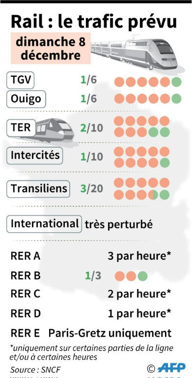 En attendant, le trafic va rester fortement réduit dimanche à la SNCF, avec 1 TGV sur 6, 15% des Transiliens (RER SNCF et trains de banlieue) et 2 TER sur 10 (grâce à des bus) en circulation. La RATP va même fermer 14 lignes de métro sur 16. Et lundi s'annonce catastrophique dans les gares et stations franciliennes. La SNCF a recommandé aux usagers d'éviter les Transiliens, craignant une affluence "très dangereuse" dans les gares d'Ile-de-France. Même ton alarmant à la RATP qui invite "tous les voyageurs qui en ont la possibilité à différer leurs déplacements", compte tenu du "fort risque de saturation du réseau" avec notamment 10 lignes de métro fermées.