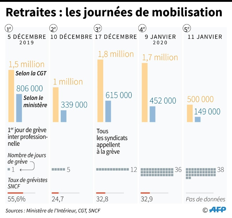 L'enjeu pour ces syndicats est de retrouver une mobilisation conséquente après une journée d'actions locales mardi peu suivie et des journées nationales en recul: le 11, la police avait dénombré 149.000 manifestants après 452.000 jeudi 9 janvier, contre 805.000 lors de la première journée du 5 décembre.