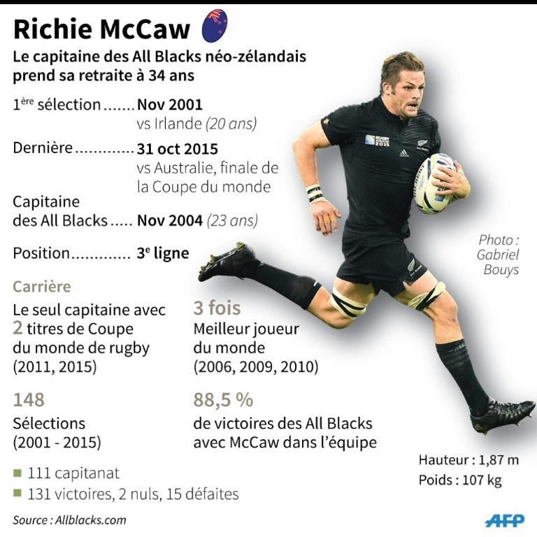 Au premier rang, le flanker Richie McCaw (34 ans, 148 sélections, record mondial), adoubé par Hansen comme le plus grand All Black de tous les temps en raison de son éternel dévouement aux tâches obscures. A ses côtés, l'ouvreur Dan Carter (33 ans, 112 sél), décrié avant le début du Mondial et finalement désigné meilleur joueur de l'année grâce à son talent et son incroyable sang froid dans les moments décisifs.