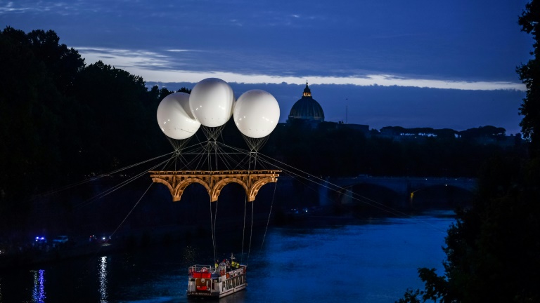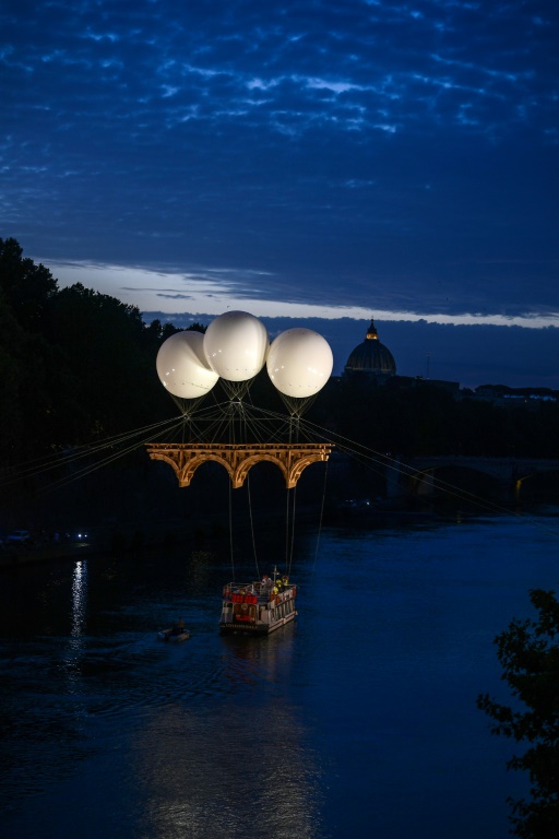 L'ouvrage de 18 mètres suspendu par trois ballons de six mètres de diamètre gonflés à l'hélium a été inauguré mardi soir en présence de la maire de Rome, Virginia Raggi, et de l'ambassadeur de France, Christian Masset.