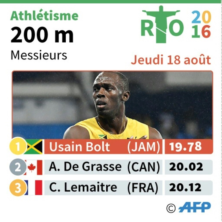 Après une journée de scandales en tout genre, la lumière des JO de Rio est revenue jeudi soir: Bolt s'est envolé sur le 200 m, pendant que le Français Christophe Lemaitre s'offrait une 3e place de très grande classe.