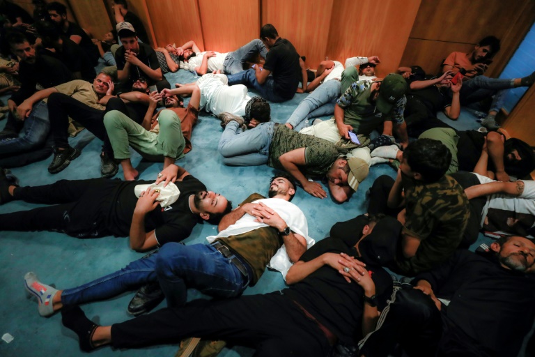 Dans le Parlement, les manifestants entonnent des chants religieux à l'occasion du mois lunaire de Mouharam, qui débutera dimanche en Irak et durant lequel les chiites célèbreront Achoura, commémoration du martyre de l'imam Hussein, gendre du prophète Mahomet et fils de l'imam Ali.